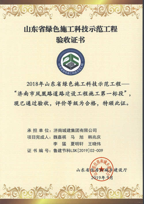濟(jì)南市鳳凰路道路建設(shè)工程施工第一標(biāo)段被評(píng)為被評(píng)為2018年山東省綠色施工科技示范工程